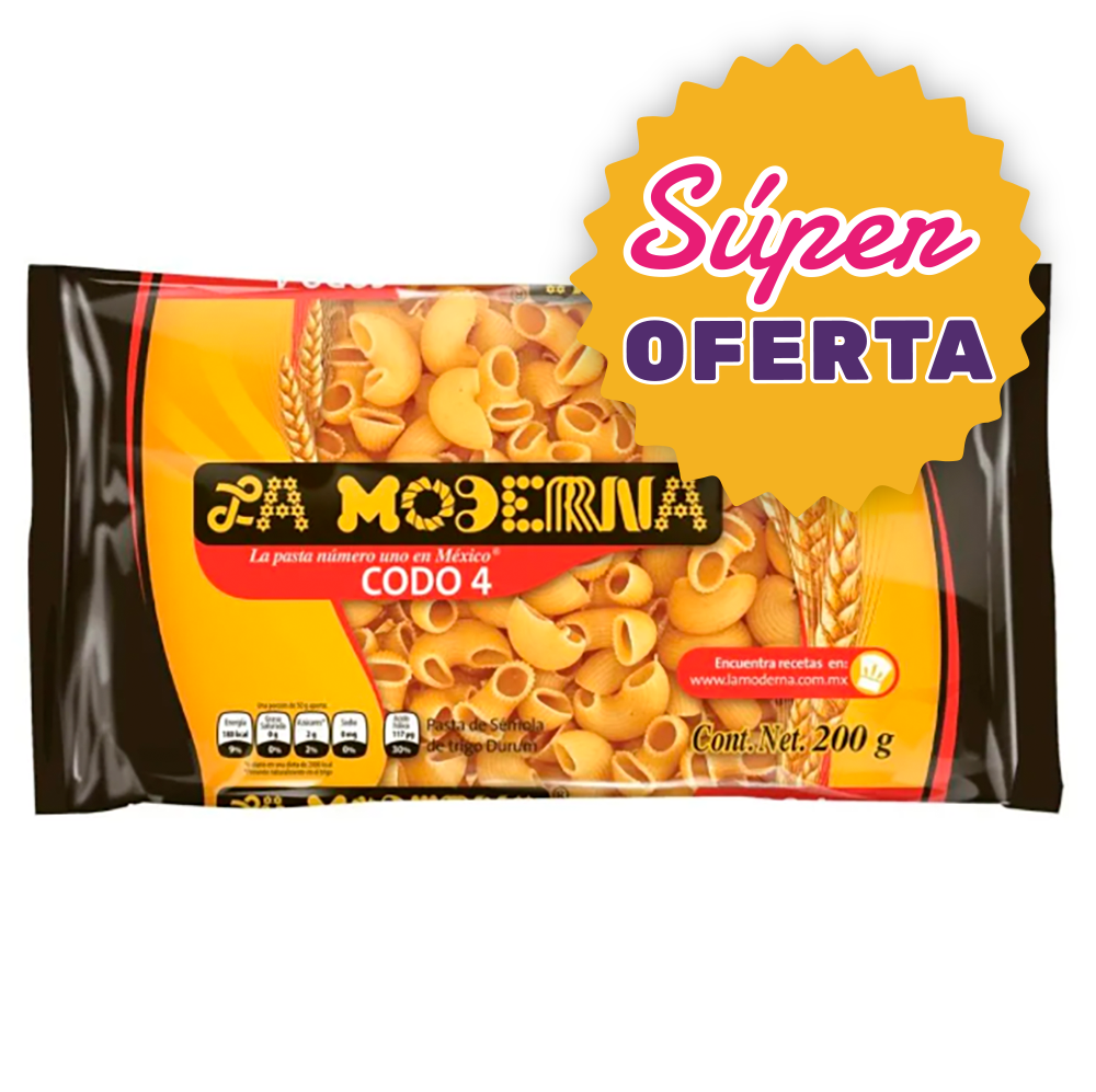 Compra la Pasta Codo Moderna 200 gr (4 pzas) en superlavioleta.com y disfruta recetas prácticas, sabrosas y nutritivas.