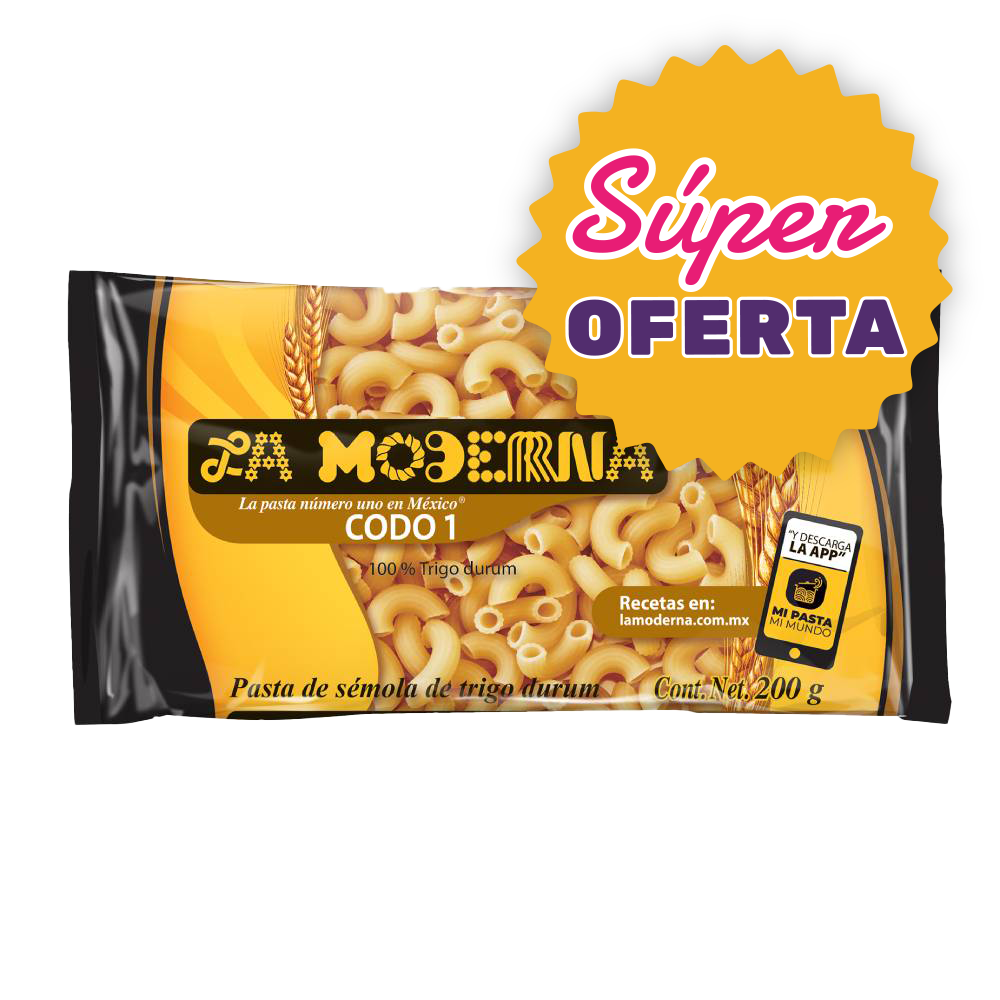 Prepara platillos deliciosos con la Pasta de Codo Moderna en presentación de 200 gramos. Ideal para ensaladas frías, sopas o guisos, esta pasta es elaborada con sémola de trigo de alta calidad, garantizando una textura perfecta al cocinar.