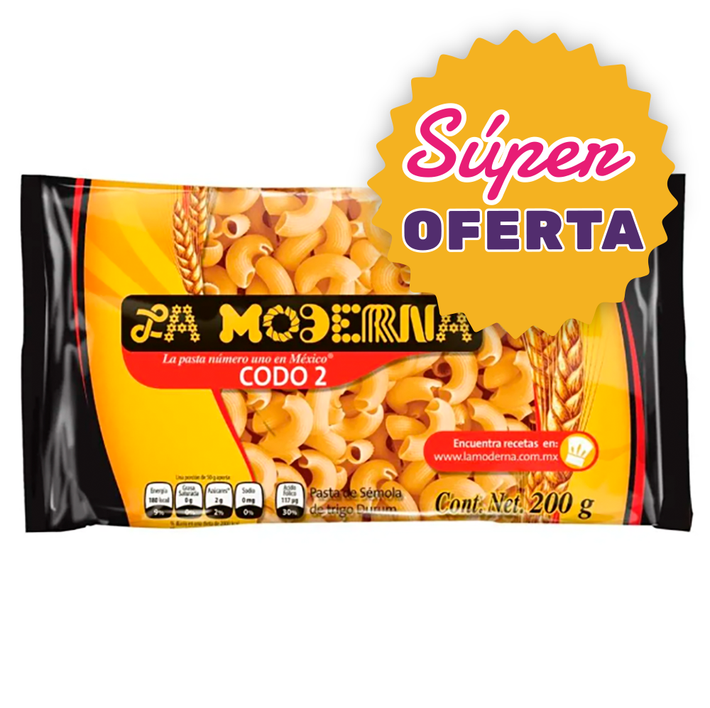 Prepara tus platillos favoritos con la Pasta Codo Moderna 200 g. Ideal para sopas, pastas frías, ensaladas o guisos tradicionales, esta pasta de trigo seleccionada ofrece una cocción perfecta, textura firme y sabor que encanta a toda la familia. Con la calidad de la marca Moderna, es un básico indispensable en cualquier despensa mexicana.