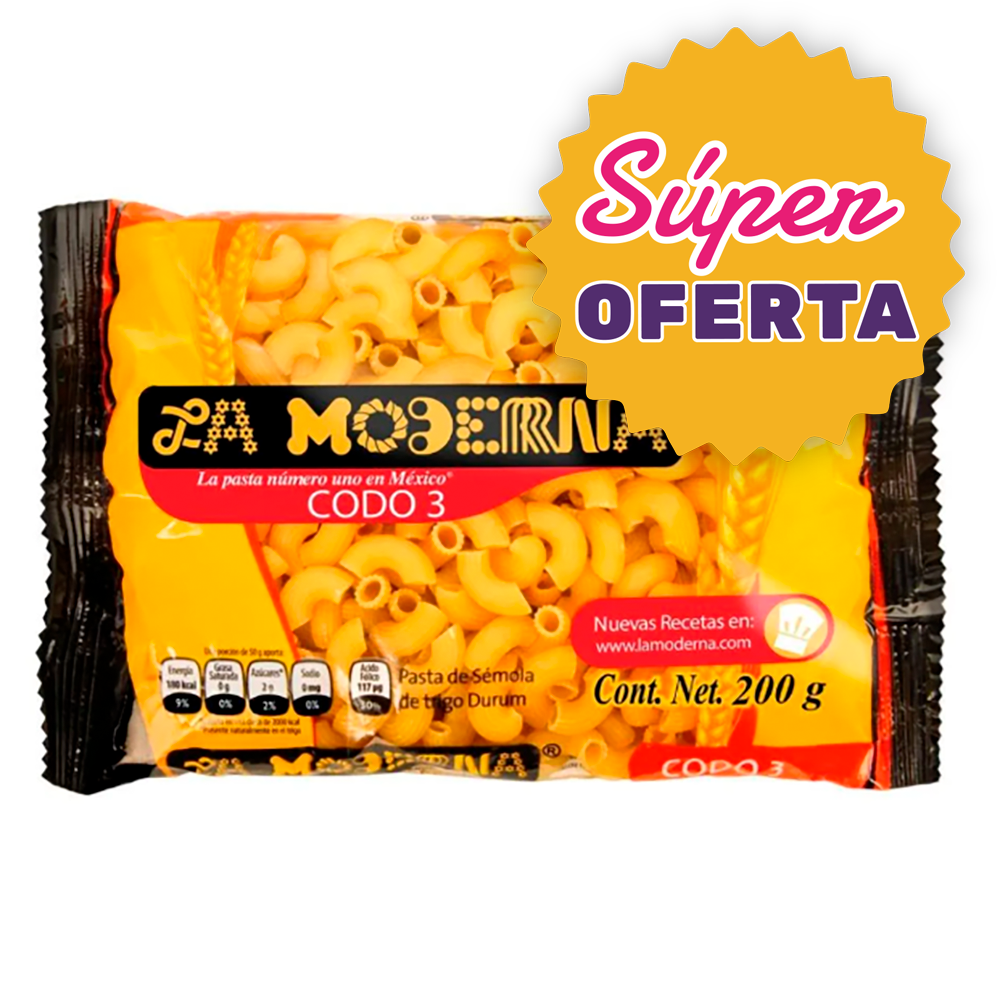 Prepara los platillos más tradicionales y sabrosos con la Pasta Codo Moderna 200 g, ahora en presentación de 3 paquetes. Ideal para sopas, ensaladas frías o pastas con crema, esta pasta de sémola de trigo duro se cocina en pocos minutos y mantiene su textura al dente.